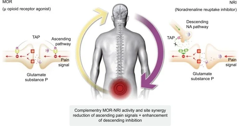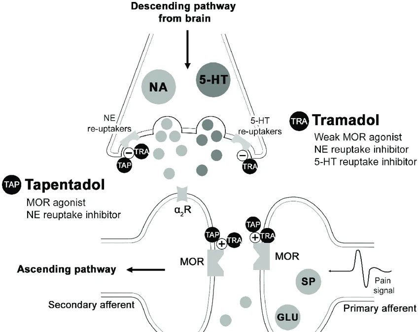 Image Credit - https://www.researchgate.net/figure/Tapentadol-mechanism-of-action-at-spinal-level_fig2_333129655