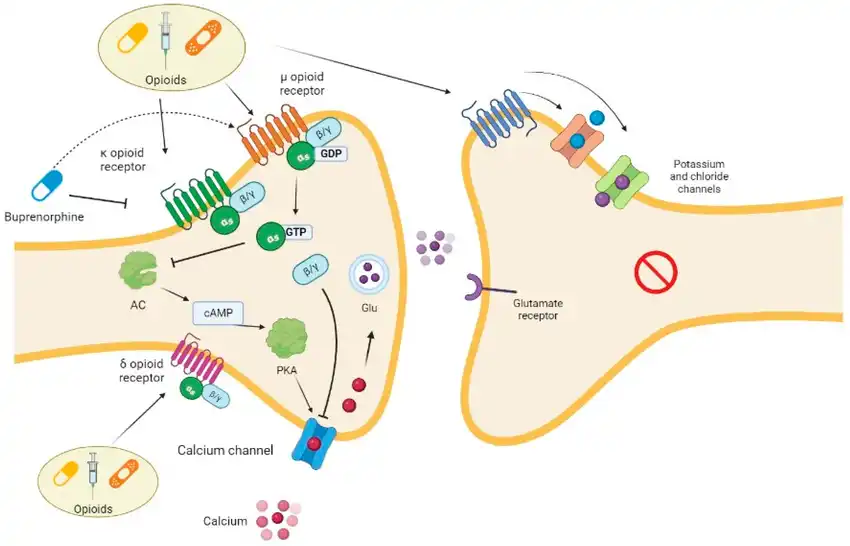 Image Credit - https://www.researchgate.net/figure/Opioid-mechanism-of-action-Opioids-bind-to-their-m-k-and-d-receptors-at-presynaptic_fig1_369872688